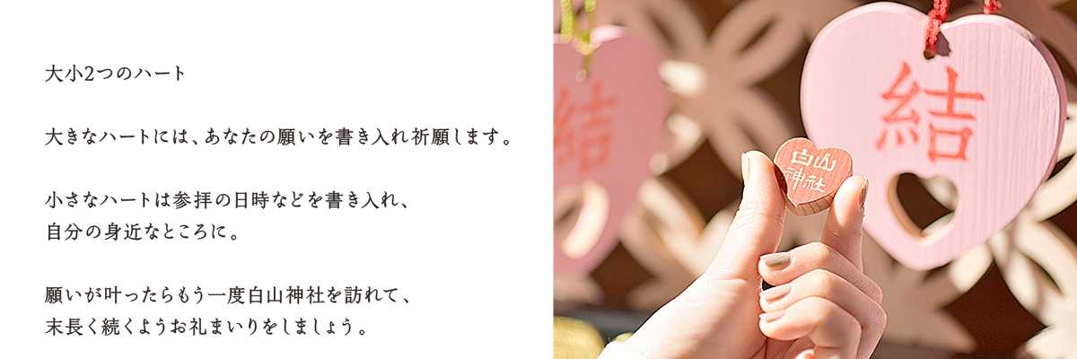 • 大小2つのハート。大きなハートには、あなたの願いを書き入れ祈願します。小さなハートは参拝の日時などを書き入れ、自分の身近なところに。願いが叶ったらもう一度白山神社を訪れて、末長く続くようお礼まいりをしましょう。