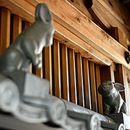 • 結びの絵馬だけの特別。専用の絵馬掛けや天井には円満を意味する七宝文様を使い、大国さまと八上比売(やかみひめ)という美しい姫との縁にゆかりのある因幡の白兎を新潟の安田瓦で作りあげ、より良いご縁となることを願い飾られています。夜には、天井からの素敵な灯りでご祈願の皆さんを照らします。