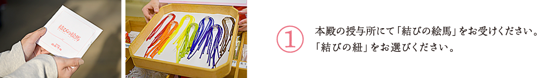 • 本殿の授与所にて「結びの絵馬」をお受けください。「結びの紐」をお選びください。