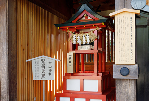 えんむすびで有名な島根県・出雲国一宮、出雲大社の御祭神・大国主大神(おおくにぬしのおおかみ)を勧請して祀ったものです。一般に「大国様(だいこくさま)」として親しまれ、「えんむすびの神」 「福の神」としても、広く慕われ敬われております。白山神社本殿の階段を降りてすぐ右側に小さな神社があります。おまいりすれば、より多くの福をよびこみ、えんむすびのご利益も増すことと思います。